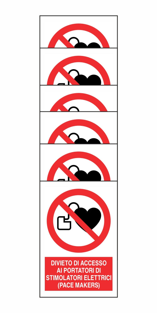 KIT DI 6 ADESIVI RETTANGOLARI - DIVIETO DI ACCESSO AI PORTATORI DI STIMOLATORI - Pittogramma ISO 7010 Con Stampa Diretta U.V. (IDEALE ANCHE PER ESTERNO)