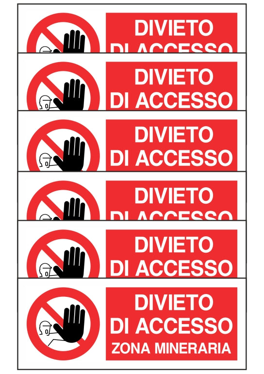KIT DI 6 ADESIVI RETTANGOLARI - DIVIETO DI ACCESSO ZONA MINERARIA - Pittogramma ISO 7010 Con Stampa Diretta U.V. (IDEALE ANCHE PER ESTERNO)