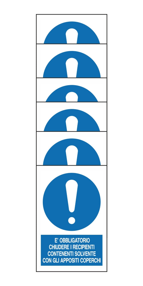 KIT DI 6 ADESIVI RETTANGOLARI - E' OBBLIGATORIO CHIUDERE I RECIPIENTI CONTENENTI SOLVENTE - Pittogramma ISO 7010 Con Stampa Diretta U.V. (IDEALE ANCHE PER ESTERNO)