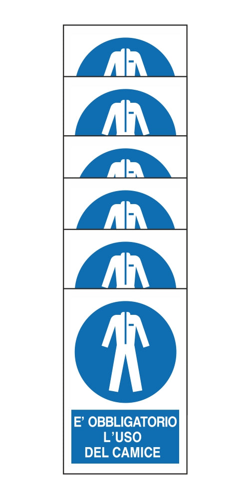 KIT DI 6 ADESIVI RETTANGOLARI - E' OBBLIGATORIO L'USO DEL CAMICE - Pittogramma ISO 7010 Con Stampa Diretta U.V. (IDEALE ANCHE PER ESTERNO)