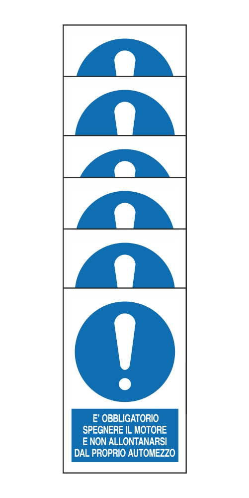KIT DI 6 ADESIVI RETTANGOLARI - E' OBBLIGATORIO SPEGNERE IL MOTORE E NON ALLONTANARSI DAL PROPRIO AUTOMEZZO - Pittogramma ISO 7010 Con Stampa Diretta U.V. (IDEALE ANCHE PER ESTERNO)