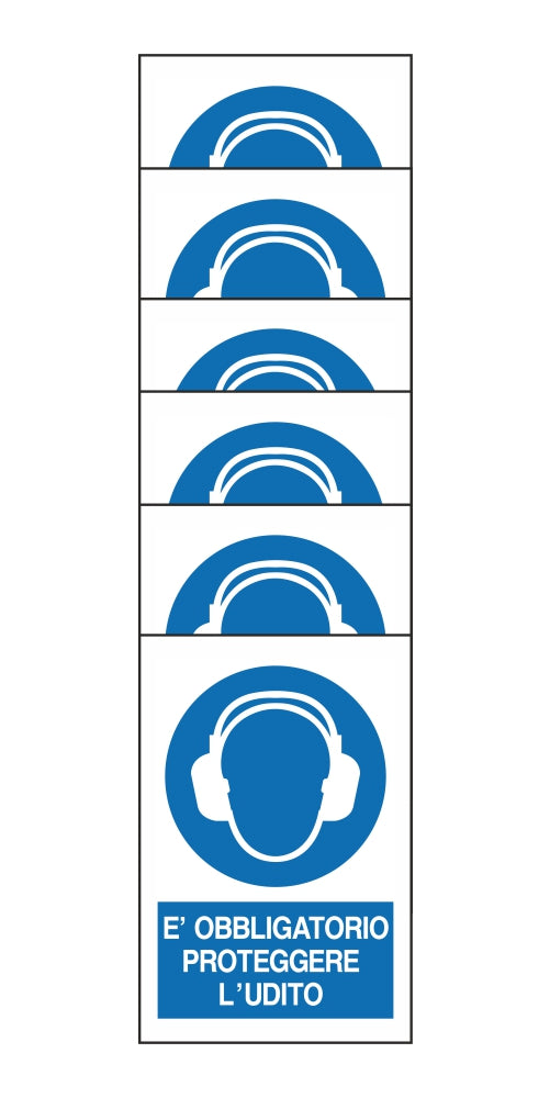 KIT DI 6 ADESIVI RETTANGOLARI - E'OBBLIGATORIO PROTEGGERE L'UDITO - Pittogramma ISO 7010 Con Stampa Diretta U.V. (IDEALE ANCHE PER ESTERNO)