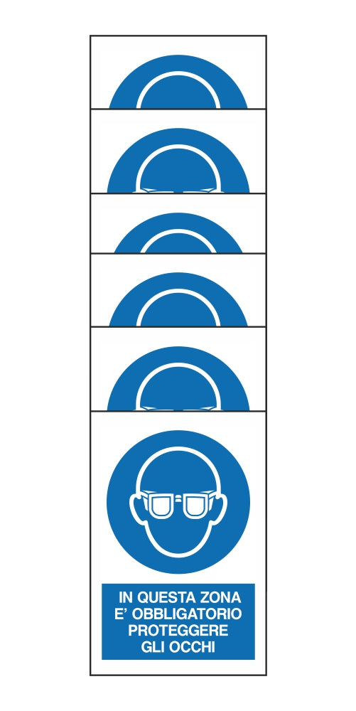 KIT DI 6 ADESIVI RETTANGOLARI - IN QUESTA ZONA E' OBBLIGATORIO PROTEGGERE GLI OCCHI - Pittogramma ISO 7010 Con Stampa Diretta U.V. (IDEALE ANCHE PER ESTERNO)