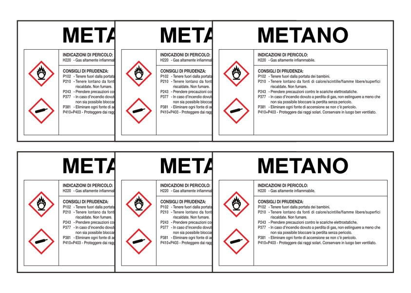 KIT DI 6 ADESIVI RETTANGOLARI - METANO RISCHI E CONSIGLI DI PRUDENZA - Pittogramma ISO 7010 Con Stampa Diretta U.V. (IDEALE ANCHE PER ESTERNO)