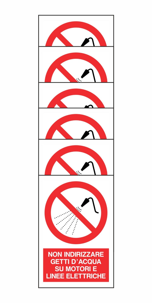 KIT DI 6 ADESIVI RETTANGOLARI - NON INDIRIZZARE GETTI D'ACQUA SU MOTORI E LINEE ELETTRICHE - Pittogramma ISO 7010 Con Stampa Diretta U.V. (IDEALE ANCHE PER ESTERNO)