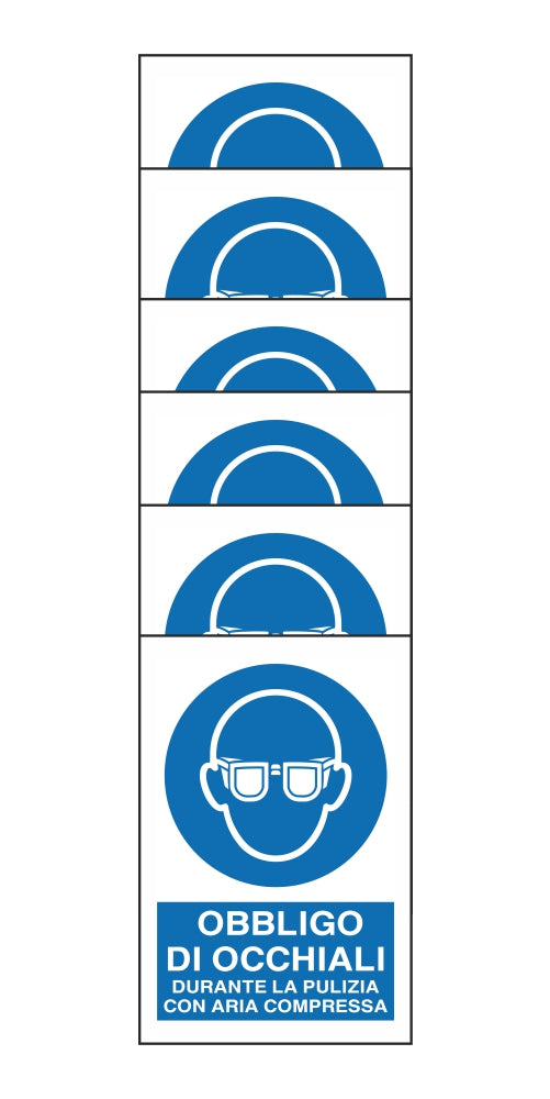 KIT DI 6 ADESIVI RETTANGOLARI - OBBLIGO DI OCCHIALI DURANTE LA PULIZIA CON ARIA COMPRESSA - Pittogramma ISO 7010 Con Stampa Diretta U.V. (IDEALE ANCHE PER ESTERNO)