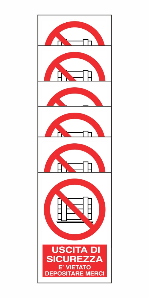 KIT DI 6 ADESIVI RETTANGOLARI - USCITA DI SICUREZZA E' VIETATO DEPOSITARE MERCI - Pittogramma ISO 7010 Con Stampa Diretta U.V. (IDEALE ANCHE PER ESTERNO)