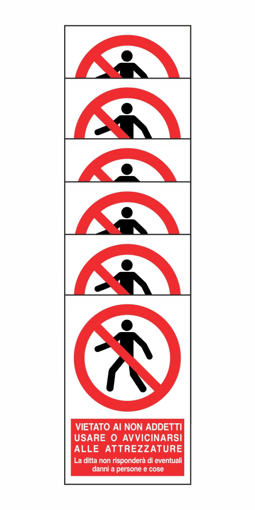 KIT DI 6 ADESIVI RETTANGOLARI - VIETATO AI NON ADDETTI USARE O AVVICINARSI ALLE ATTREZZATURE - Pittogramma ISO 7010 Con Stampa Diretta U.V. (IDEALE ANCHE PER ESTERNO)