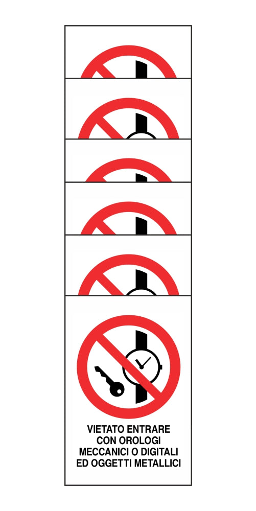 KIT DI 6 ADESIVI RETTANGOLARI - VIETATO ENTRARE CON OROLOGI MECCANICI O DIGITALI - Pittogramma ISO 7010 Con Stampa Diretta U.V. (IDEALE ANCHE PER ESTERNO)