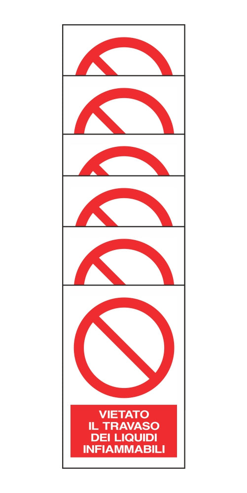 KIT DI 6 ADESIVI RETTANGOLARI - VIETATO IL TRAVASO DEI LIQUIDI INFIAMMABILI - Pittogramma ISO 7010 Con Stampa Diretta U.V. (IDEALE ANCHE PER ESTERNO)