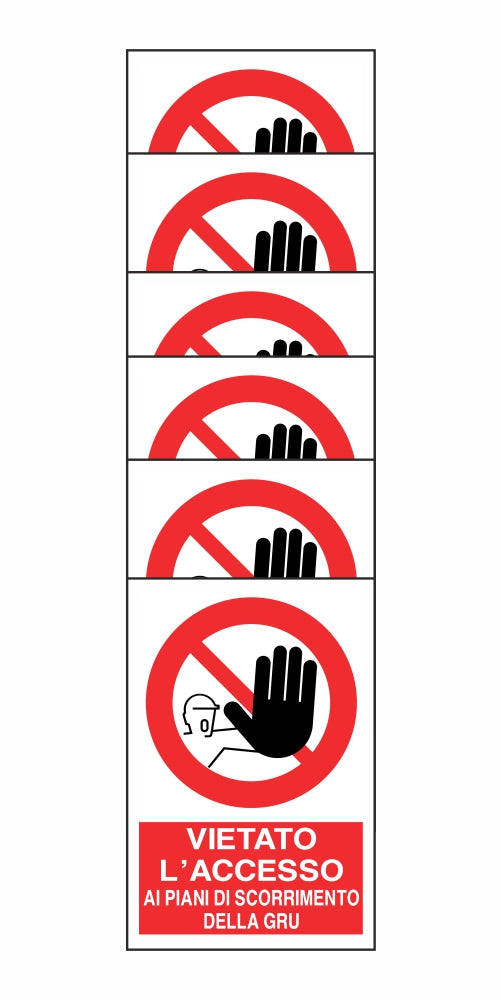 KIT DI 6 ADESIVI RETTANGOLARI - VIETATO L'ACCESSO AI PIANI DI SCORRIMENTO DELLA GRU - Pittogramma ISO 7010 Con Stampa Diretta U.V. (IDEALE ANCHE PER ESTERNO)