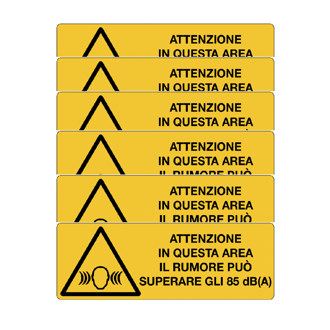 KIT DI 6 ADESIVI UNI - Attenzione in questa area il rumore può superare gli 85 dB(A)- Pittogramma ISO 7010 Con Stampa Diretta U.V. (IDEALE ANCHE PER ESTERNO)