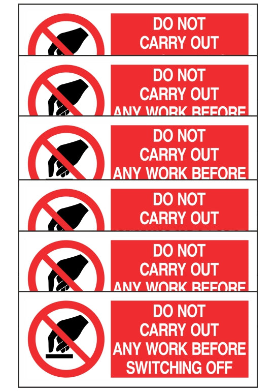KIT DI 6 ADESIVI UNI - DO NOT CARRY OUT ANY WORK BEFORE SWITCHING OFF - Pittogramma ISO 7010 Con Stampa Diretta U.V. (IDEALE ANCHE PER ESTERNO)