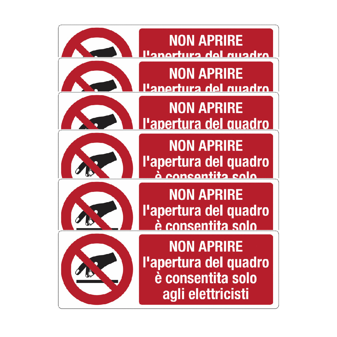 KIT DI 6 ADESIVI UNI - Non aprire, l'apertura del quadro è consentita solo agli elettricisti - Pittogramma ISO 7010 Con Stampa Diretta U.V. (IDEALE ANCHE PER ESTERNO)