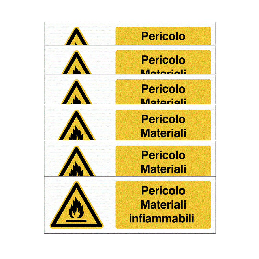 KIT DI 6 ADESIVI UNI -"Pericolo materiale infiammabile- Pittogramma ISO 7010 Con Stampa Diretta U.V. (IDEALE ANCHE PER ESTERNO)