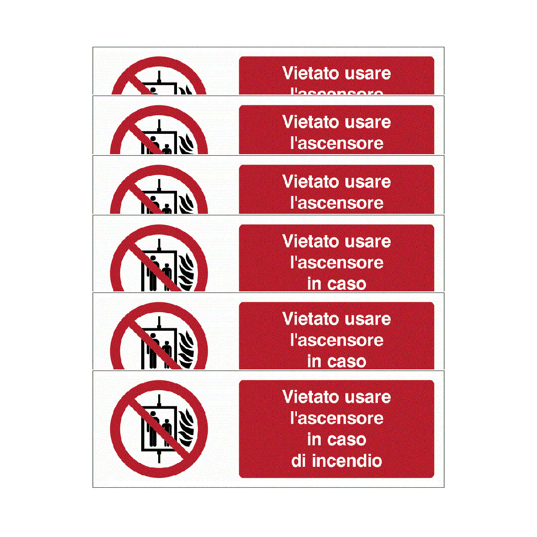 KIT DI 6 ADESIVI UNI - Vietato usare l'ascensore in caso di incendio - Pittogramma ISO 7010 Con Stampa Diretta U.V. (IDEALE ANCHE PER ESTERNO)