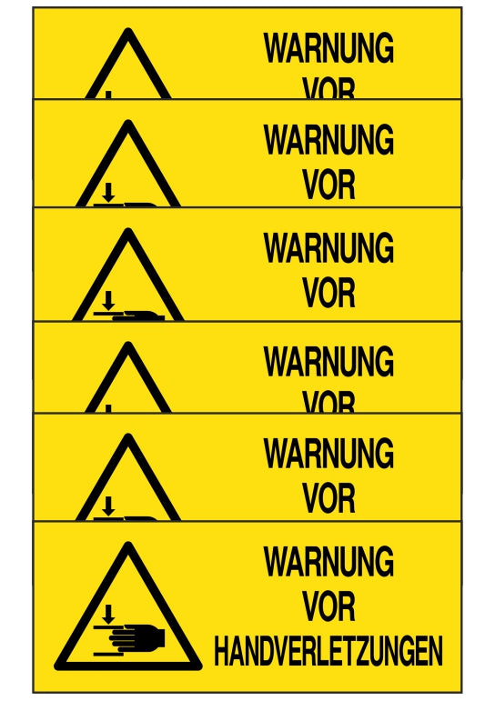 KIT DI 6 ADESIVI UNI - WARNUNG VOR HANDVERLETZUNGEN - Pittogramma ISO 7010 Con Stampa Diretta U.V. (IDEALE ANCHE PER ESTERNO)