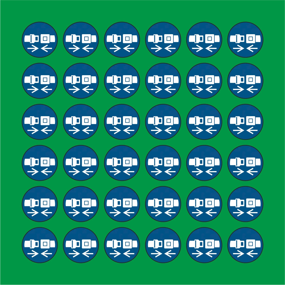 PACCO DA 6 KIT DI 6 ADESIVI ROTONDI - Allacciare la cintura di sicurezza - Pittogramma ISO 7010 Con Stampa Diretta U.V.