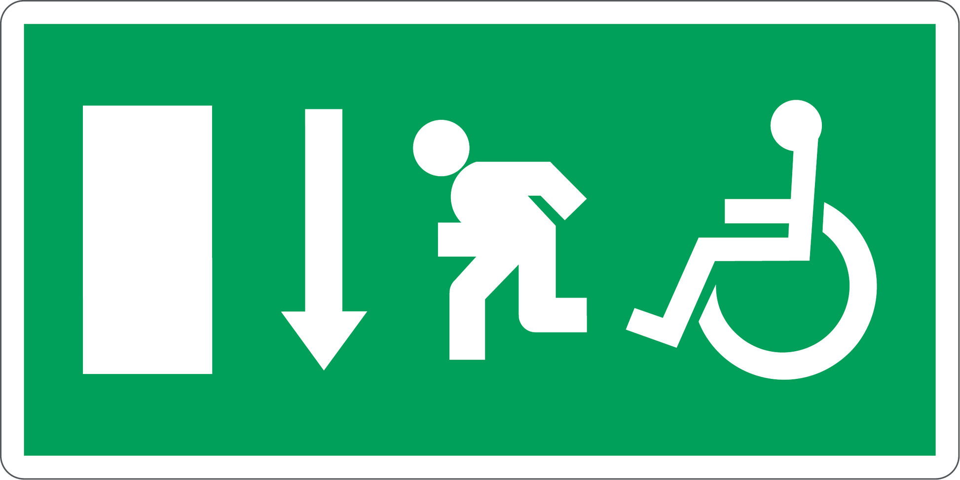USCITA DI EMERGENZA DISABILI VERSO IL BASSO NORMA CE - CARTELLO SEGNALETICO UNI ISO 7010 in Adesivo, Pannello in Forex, Pannello In Alluminio